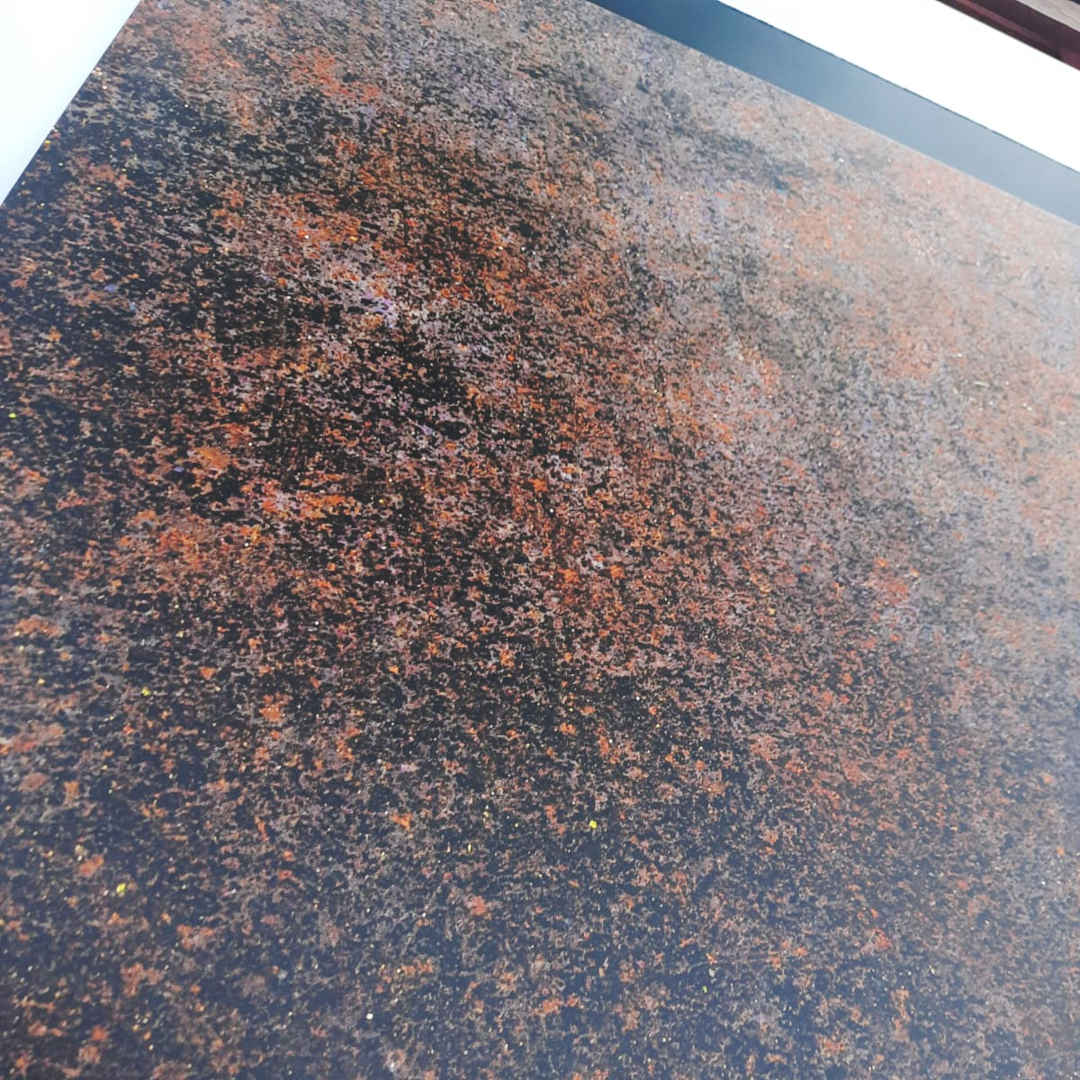Per dare un ulteriore effetto vintage, abbiamo creato un “Effetto Rust” sul fondo, applicando una pellicola adesiva con la stampa di un pattern corten. La stampa e l’installazione delle pellicole che riproducono in modo realistico l’effetto corten, sono adatte sia per l’uso in interno che in esterno e creare così ambienti unici di interior design.